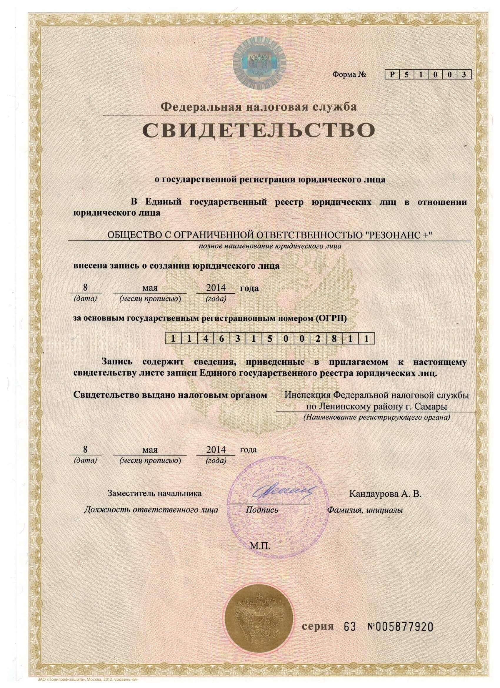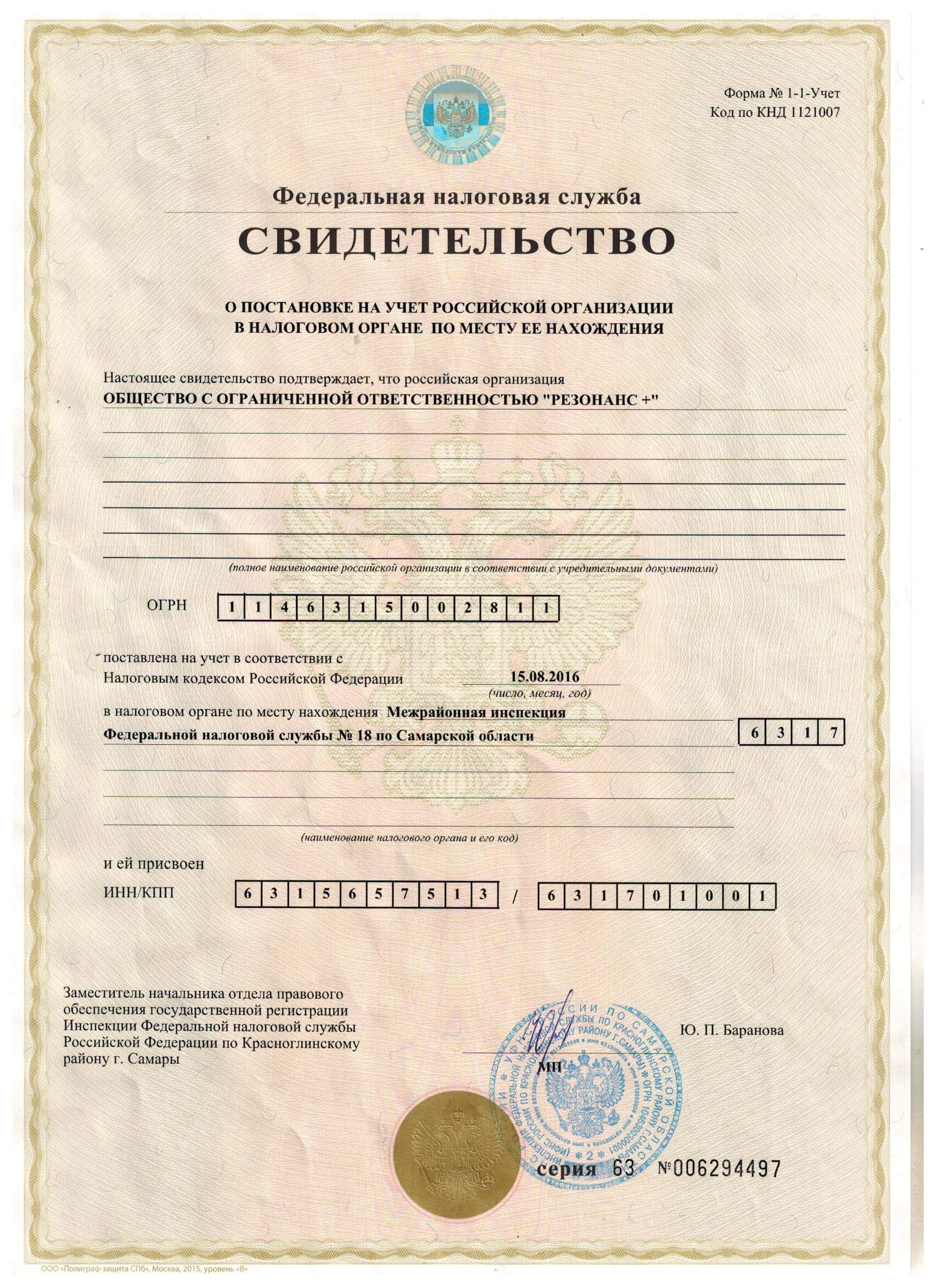 Свидетельство о государственной регистрации юридического лица и о постановке на учет в налоговом органе