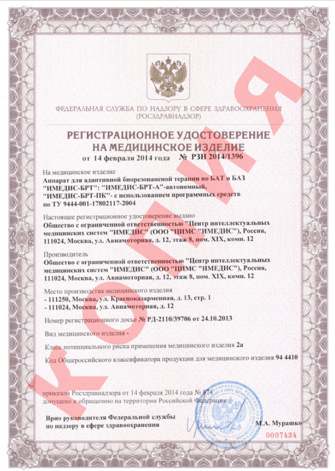 АППАРАТ "ИМЕДИС-БРТ-А"Аппарат "ИМЕДИС-БРТ-А" предназначен для проведения:Лечебное воздействие осуществляется на основе обработки и нормализации собственных электромагнитных колебаний организма пациента согласно концепции меридианного и системного подходов, и как следствие этого, восстановление функционального состояния (гомеостаза) организма пациента.